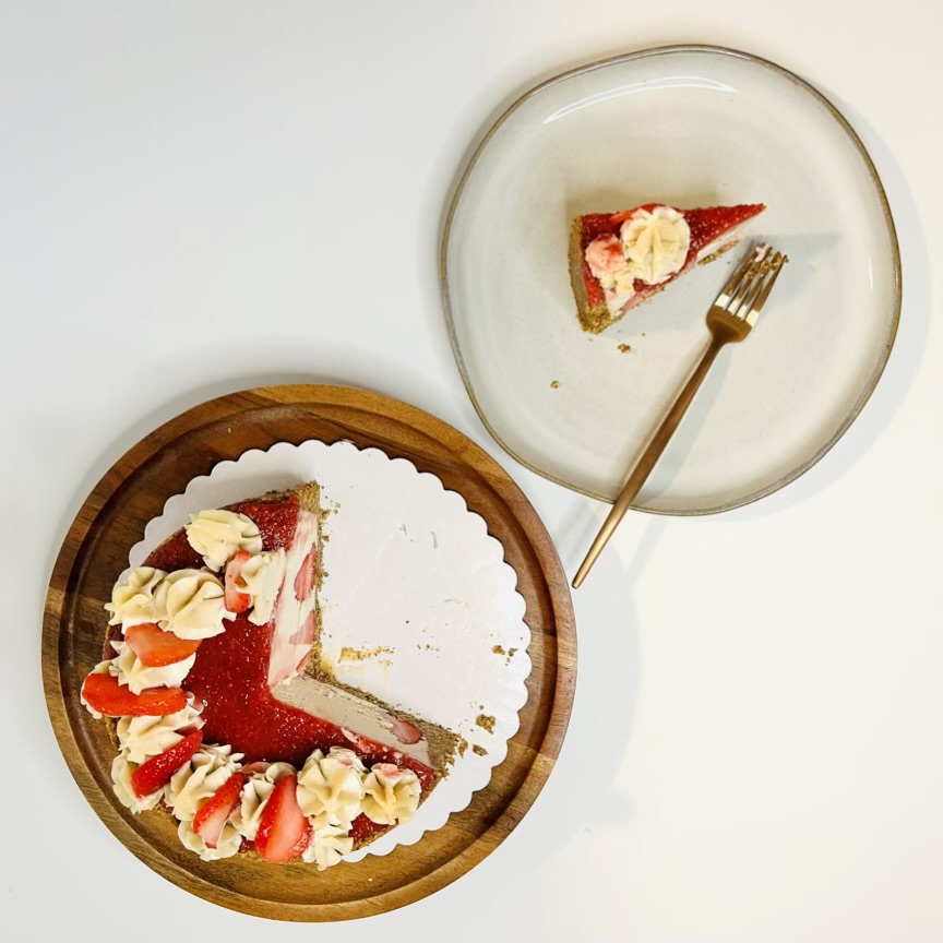 Esta combinación increíble nos aporta vitamina C, E, K, B6 y de minerales como manganeso, ácido fólico, hierro, cobre, magnesio, fósforo, proveniente de las frutillas. La crema de queso fermentada esta hecha con anacardos que son fuente de proteínas, grasas saludables, fibra dietética, vitaminas y minerales. Este postre ademas de satisfacer las ganas de comer un sabroso dulce sin culpas, sin gluten, lácteos ni azúcar refinado, nos nutre debido al contenido de sus ingredientes, entonces realmente es una comida dulce mas que un simple postre.