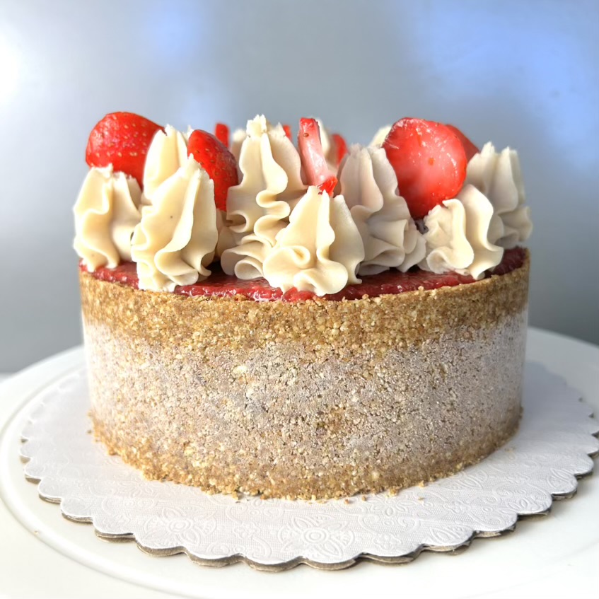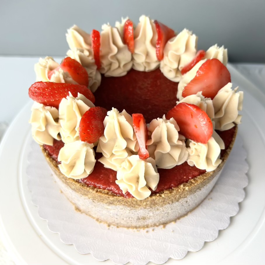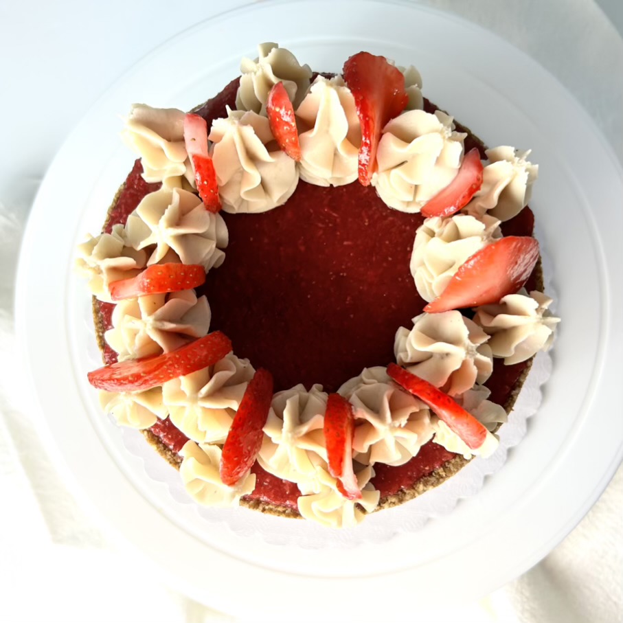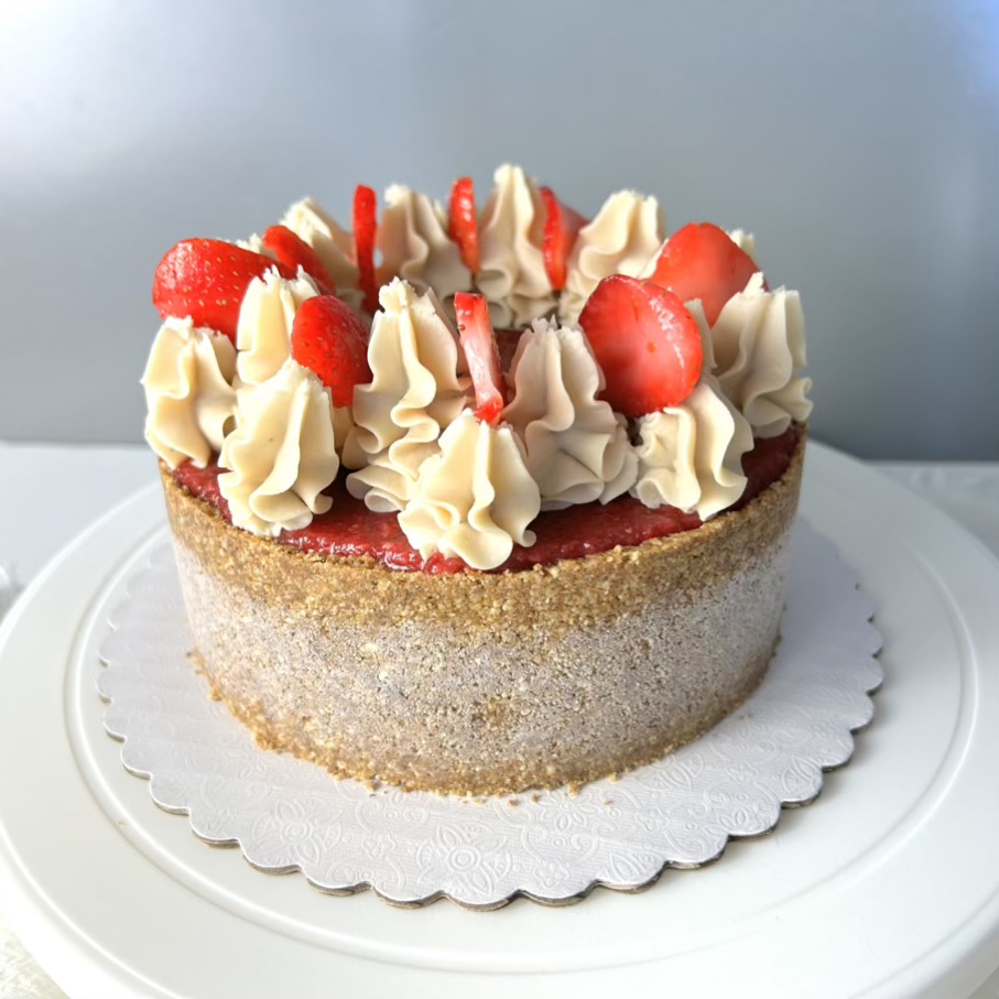 This incredible combination provides us with vitamin C, E, K, B6 and minerals such as manganese, folic acid, iron, copper, magnesium, phosphorus, from strawberries. The fermented cream cheese is made with cashews which are a source of protein, healthy fats, dietary fiber, vitamins and minerals. This dessert besides satisfying the desire to eat a tasty sweet without guilt, gluten, dairy or refined sugar, nourishes us due to the content of its ingredients, so it really is a sweet meal rather than a simple dessert.
